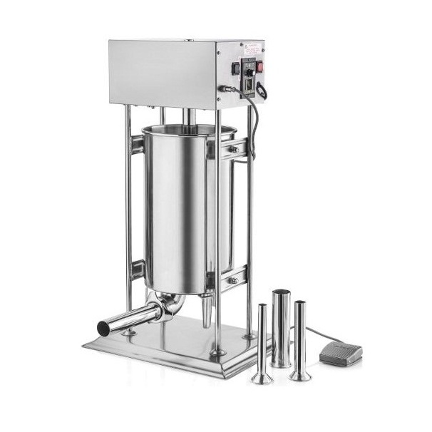 سوسیس پرکن 20 لیتری برقی الکتروکار مدل EC-29 یکی از انواع دستگاه سوسیس پرکن موجود در بازار است که ظرفیت مخزن آن به 20 لیتر می‌رسد. این سوسیس پرکن برقی ساختاری ایستاده دارد و در هر با استفاده قادر است تعداد زیادی سوسیس تهیه نماید. تمام قطعات الکترونیکی این نمونه از سوسیس پرکن الکتروکار در قسمت بالای آن قرار گرفته است. بنابراین به راحتی می‌توان از آن در محیط‌های مرطوب مانند آشپزخانه استفاده کرد. اجزای این دستگاه سوسیس پرکن شامل قیف، موتور، بدنه، مخزن و پدال است که ساختار کلی دستگاه را تشکیل می‌دهند. مزیت داشتن پدال در این دستگاه سبب می‌شود تا آزادی عمل کاربر برای جمع کردن مواد اولیه بیشتر شود. وجود یک پیچ تنظیم نیز در طراحی این دستگاه سوسیس پرکن وظیفه تند و کند کرد سرعت تهیه سوسیس را بر عهده دارد. خرید سوسیس پرکن برقی الکتروکار به رستوران‌ها، هتل‌ها و کیترینگ‌ها توصیه می‌شود به این ترتیب آنها می‌توانند تهیه سوسیس را به راحتی انجام دهند. شما می‌توانید برای استعلام قیمت سوسیس پرکن برقی الکتروکار و آگاهی از سایر ویژگی‌های آن با ما تماس بگیرید.